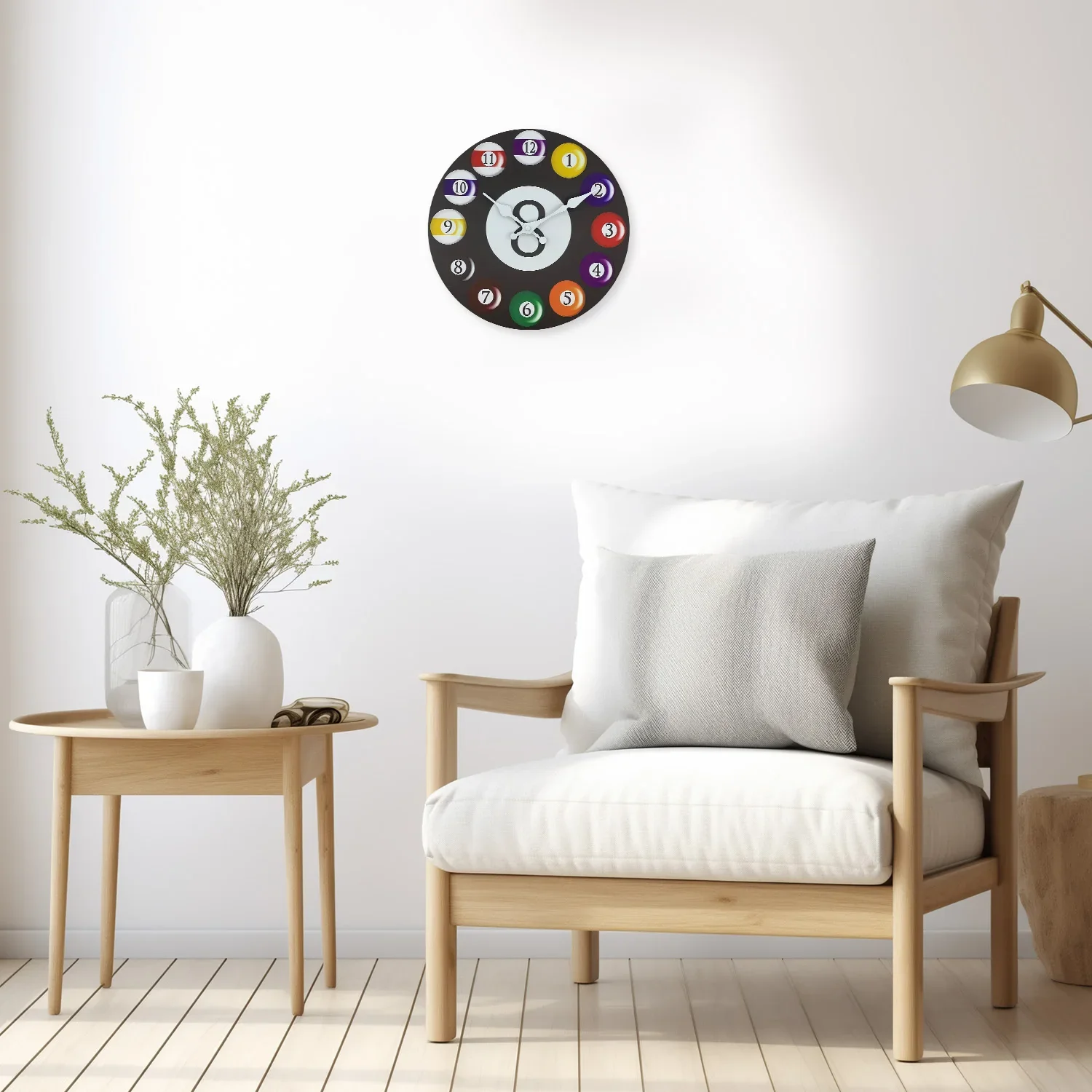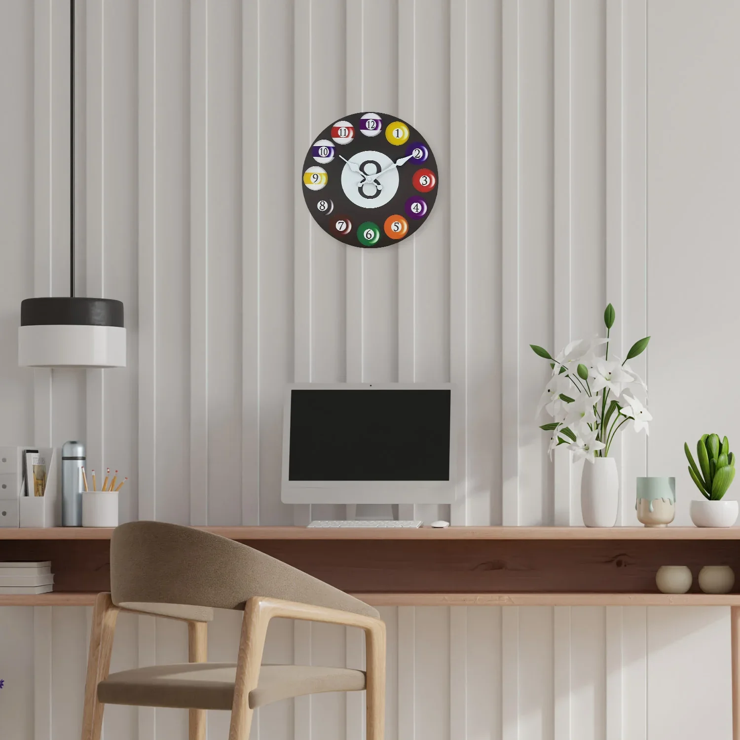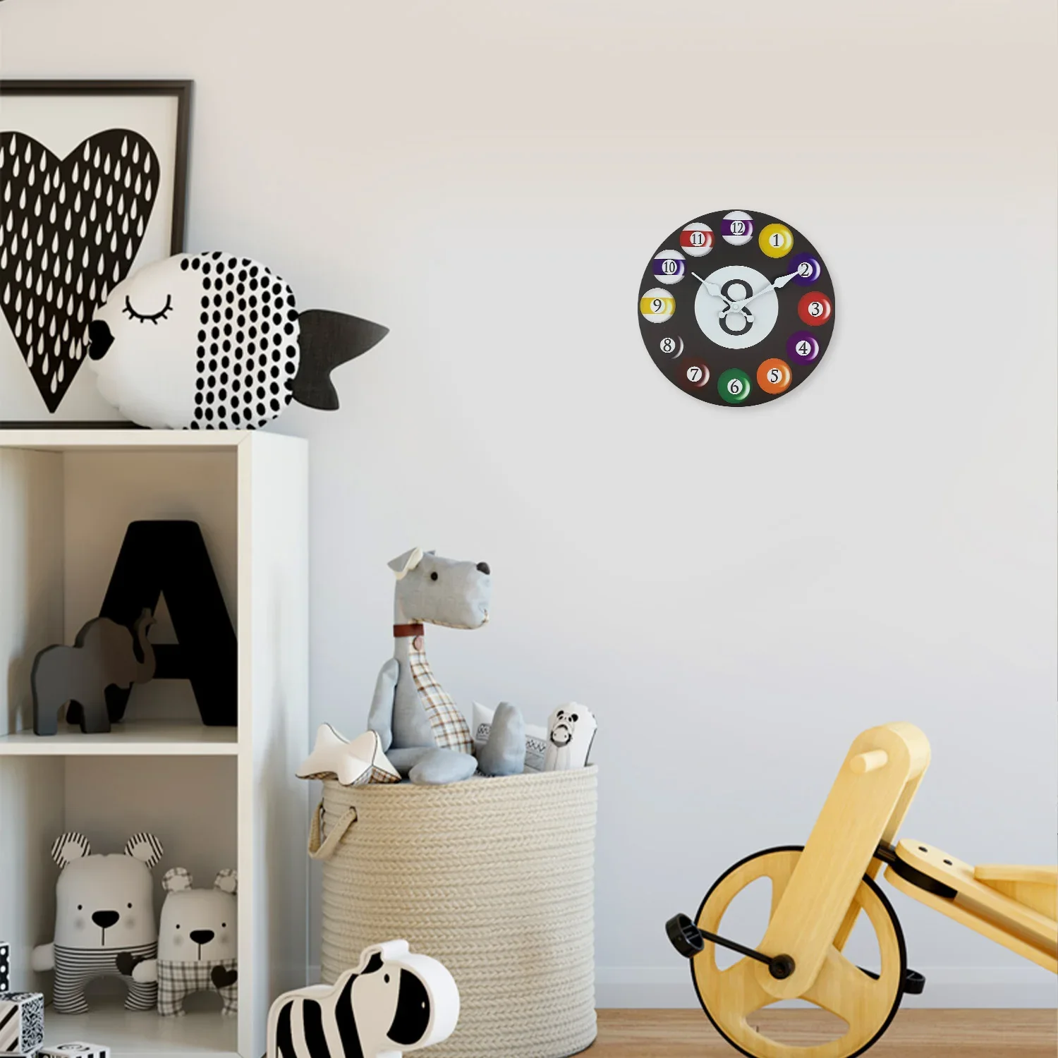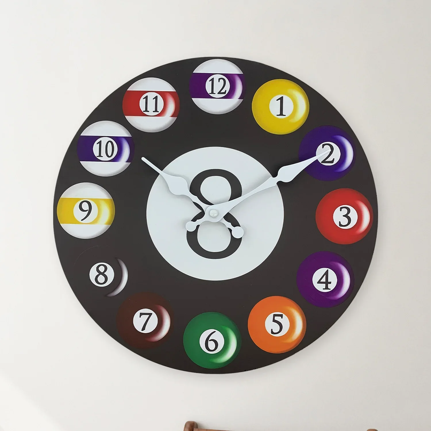 Diese Wanduhr mit farbenfrohem Billardkugel-Design bringt eine lebendige und spielerische Atmosphäre in Ihr Zuhause. Sie ist ein echter Hingucker und ideal für moderne Wohnräume.