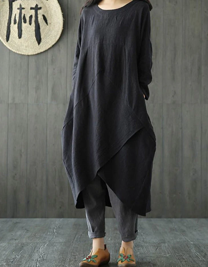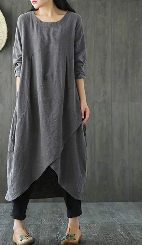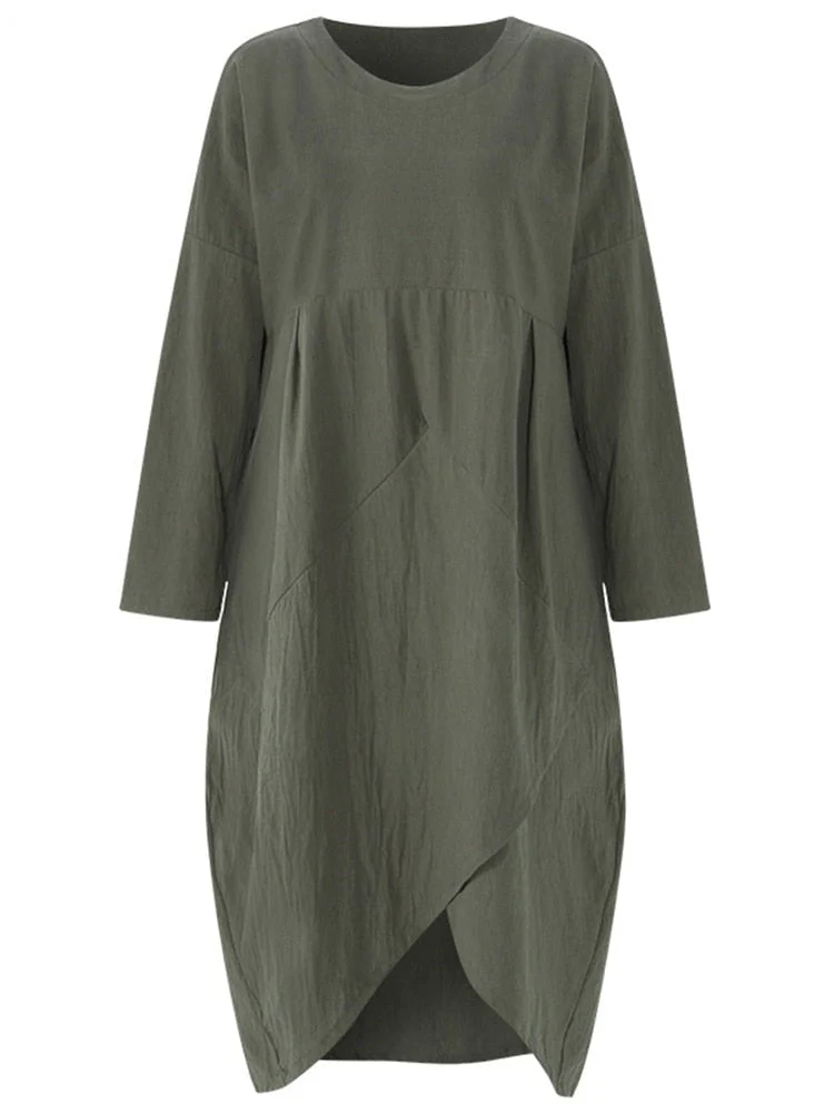 Dieses langärmelige Baumwoll-Midi-Kleid besticht durch seinen unregelmäßigen Schnitt und bietet einen modernen, femininen Look. Das weiche Baumwollmaterial sorgt für höchsten Tragekomfort. Perfekt für Frühling und Herbst, lässt es sich vielseitig kombinieren.