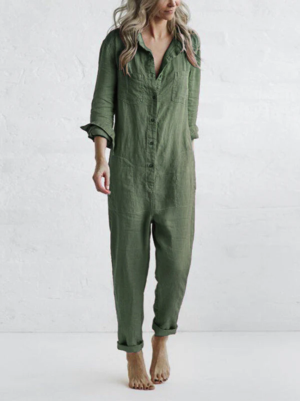 Der Jumpsuit bietet praktische Details wie einen traditionellen Knopfverschluss und zahlreiche Taschen: zwei Brusttaschen, zwei Seitentaschen und zwei Gesäßtaschen – funktional und modisch zugleich.